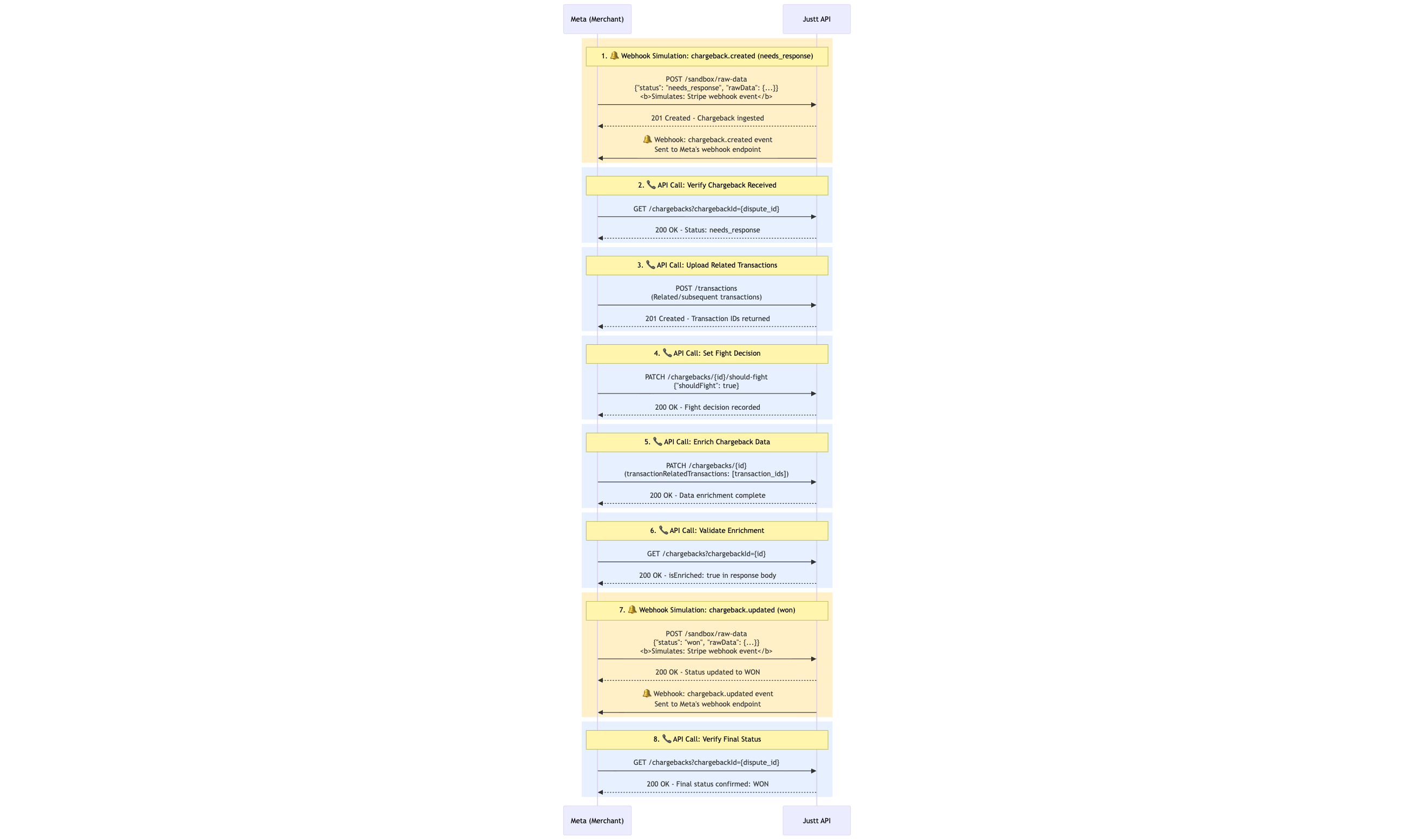 The Justt Sandbox environment allows you to test the complete chargeback lifecycle without affecting production data or incurring real costs. This testing environment enables you to simulate chargebacks, move them through different statuses, and validate your webhook integrations.